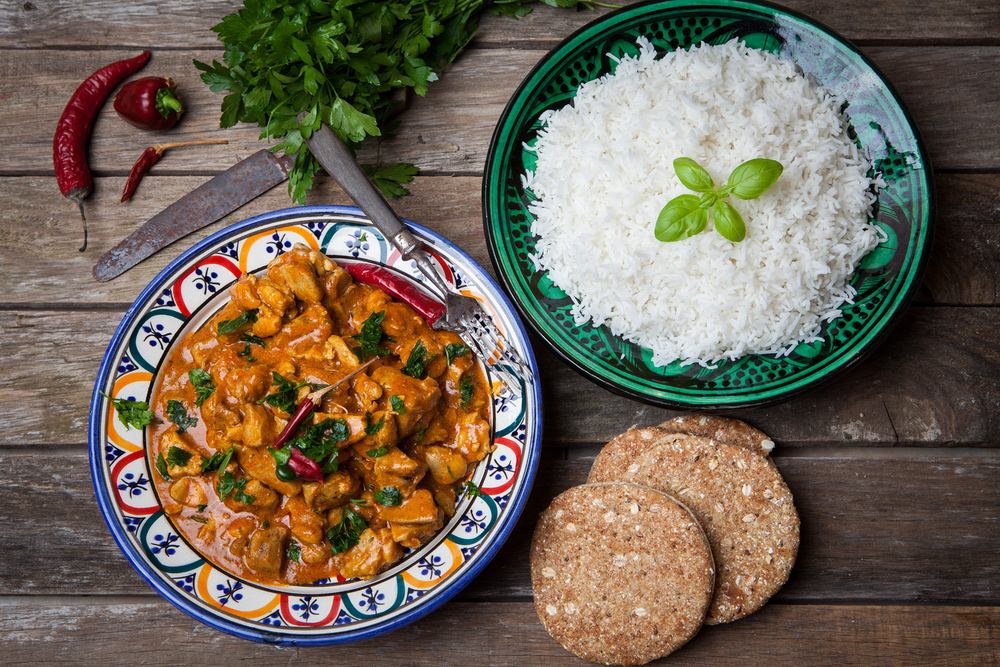 Kip gekookt met aromatische basmati rijst en geserveerd met raita